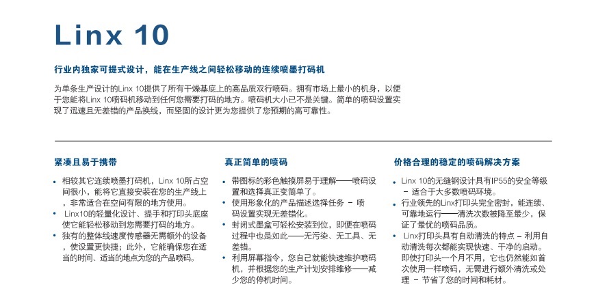 相較其它連續(xù)噴墨打碼機(jī),Linx 10所占空間很小,能將它直接安裝在您的生產(chǎn)線上,非常適合在空間有限的地方使用。